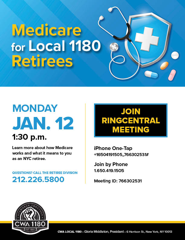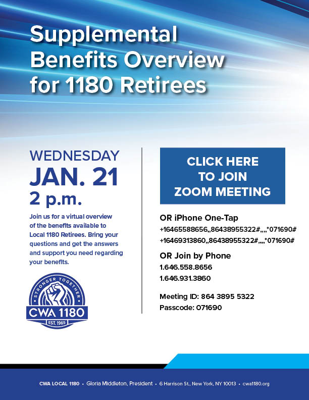 Join us for a virtual overview of the benefits available to Local 1180 Retirees. Bring your questions and get the answers and support you need regarding your benefits. | Join from PC, Mac, iOS or Android: iPhone One Tap Join by Phone Meeting ID: 864 3895 5322 | |